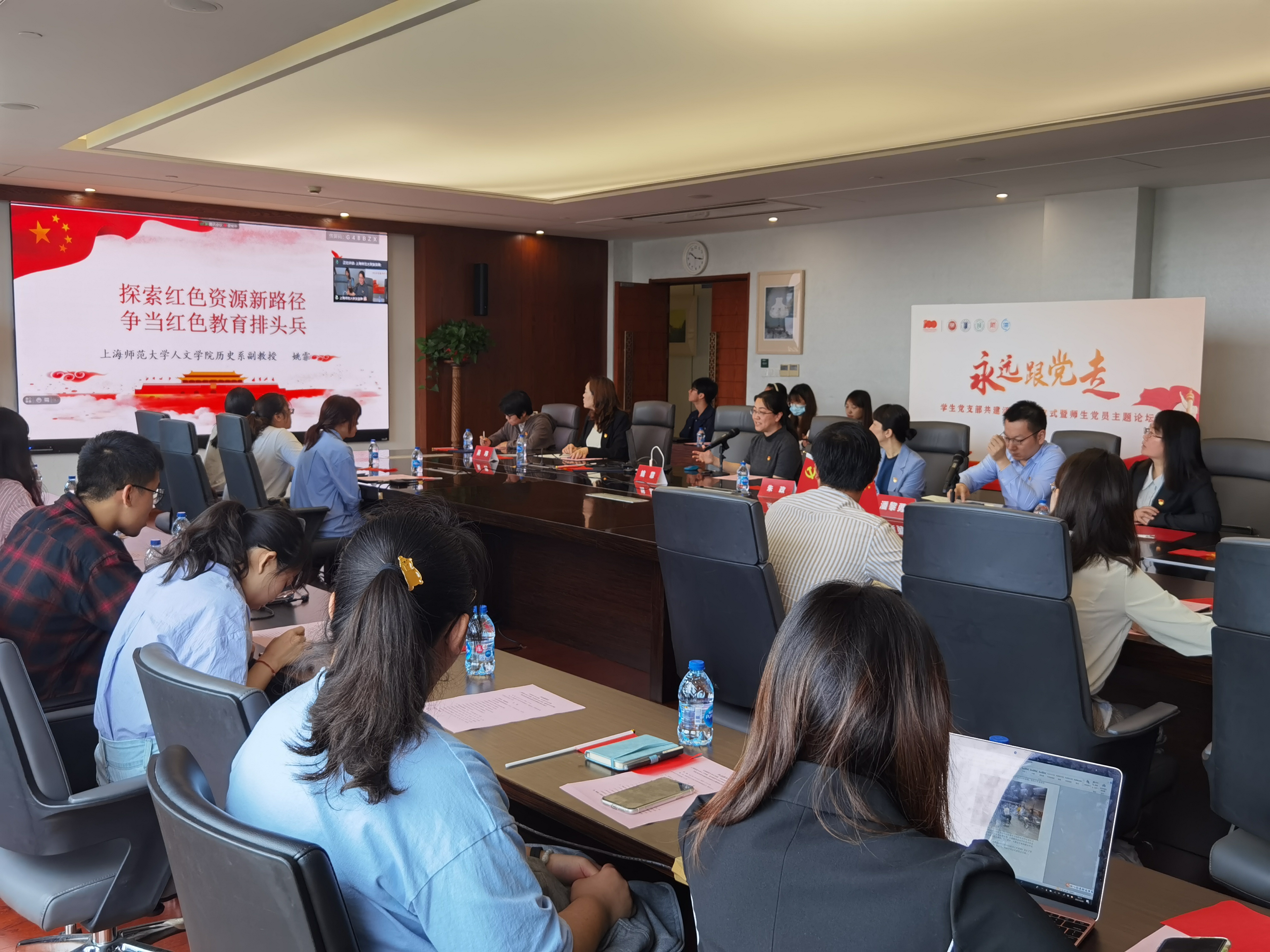 在上海师范大学分会场上,上海师范大学党委副书记、副校长葛卫华致辞。他指出,本次活动打破空间界限,在时间的交汇点上融合,不仅是我们创新高校党史学习教育方式方法的有益尝试,也是加强高校学院间党支部合作关系的重要契机,更是立足现在、面向未来、携手共进的良好机遇。通过大学生“重走红色路线”的方式,用视频生动展示上海、贵州、天津、河北、北京五地红色文化经典地标,串联出了一条跨越时空的红色脉络,让更多师生在重温党的百年奋斗历程中汲取红色力量。