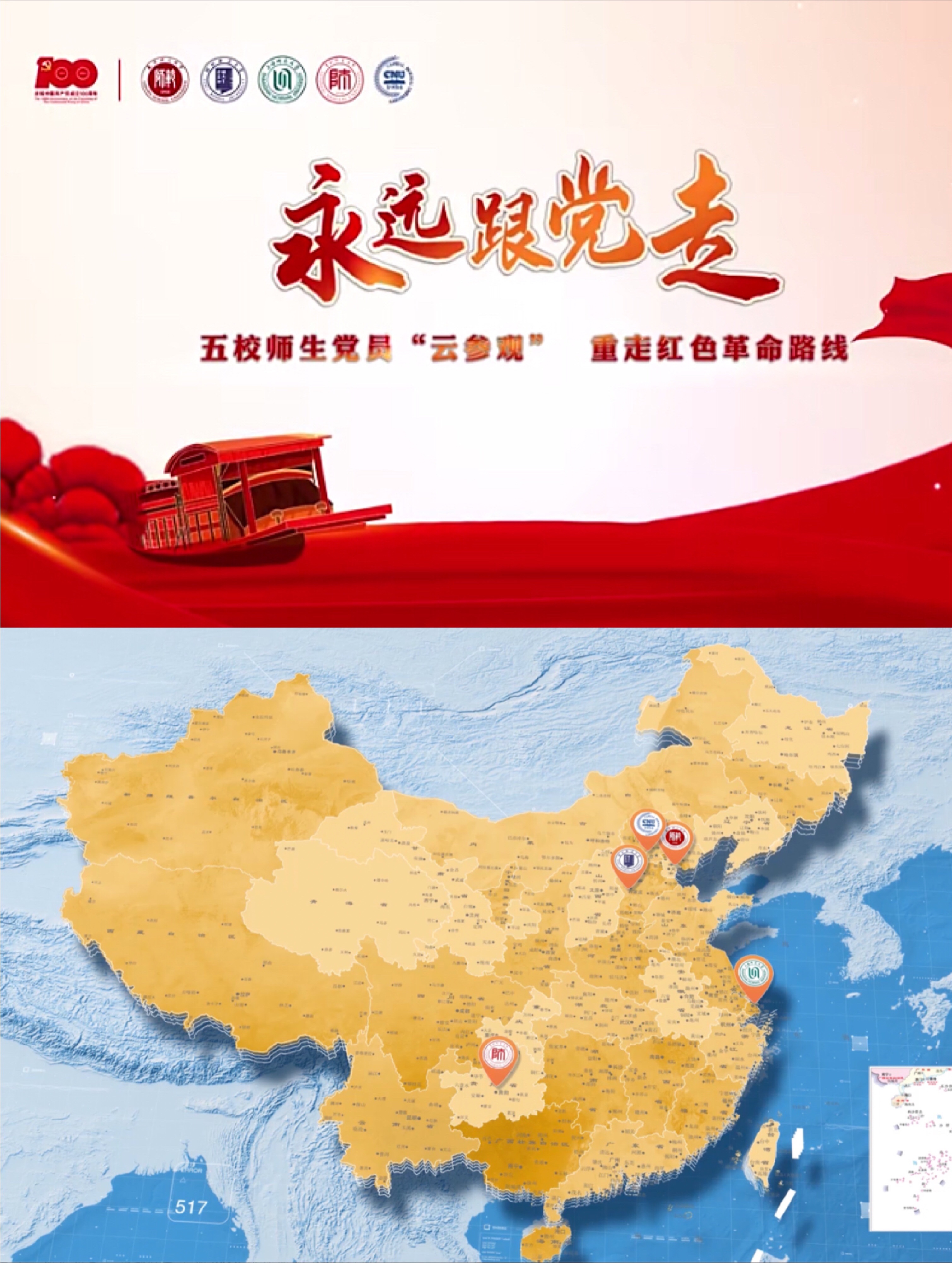 “万里河山之上,一条代表光明与希望的红色之路在中国的版图上徐徐展开。从伟大开端、初心之地上海到富含独立自主,勇闯新路精神的贵州遵义,从打开解放战争辉煌篇章的天津再到革命胜利前夜、掀开中国革命新篇章的河北西柏坡,进而来到中国共产党‘进京赶考’的第一站——北京。百年征程在历史遗址的重走中再现,革命精神在红色记忆中重温……”首都师范大学文学院、天津师范大学文学院、河北师范大学文学院、上海师范大学人文学院、贵州师范大学文学院五所院校师生合力制作的《五校师生党员“云参观”重走红色革命路线》视频拉开了本次活动的序幕。