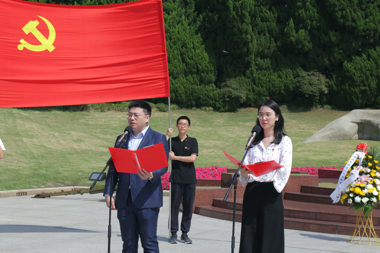 “血液写成的大字,斜斜地躺在南京路,这个难忘的日子——润饰着一年一度……”人文学院青年教师党员潘牧天副教授在无名烈士墓前的广场上深情吟诵,他与人文学院2021届毕业班党员、中国大学生“自强之星”、上海市大学生年度人物提名奖获得者张爱共同诵读红色经典诗作《血字》,情感充沛,感人至深。《血字》是由左联五烈士之一,著名的无产阶级革命诗人殷夫当时为纪念五卅运动四周年写下的不朽诗作。1925年5月30日,震惊中外的五卅运动在上海爆发,一批有志之士投身救国图强的潮流中,掀起了五卅运动革命高潮。96年后的今天,“我是海燕,我是时代的尖刺……”,五卅运动的一幕幕画面,在青年师生党员铿锵有力的诵读声中重现,字里行间的力量传递着先烈们的滴滴热血、铮铮铁骨,呈现着党员们跨越时空的致敬。