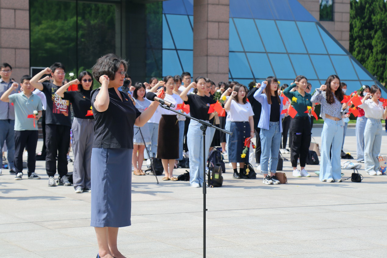 “我志愿加入中国共产党……”,在领誓人人文学院党委委员、院工会主席单虹老师的带领下,全体毕业生党员面向鲜红的党旗,重温入党誓词,作出一名毕业班党员的庄严承诺。