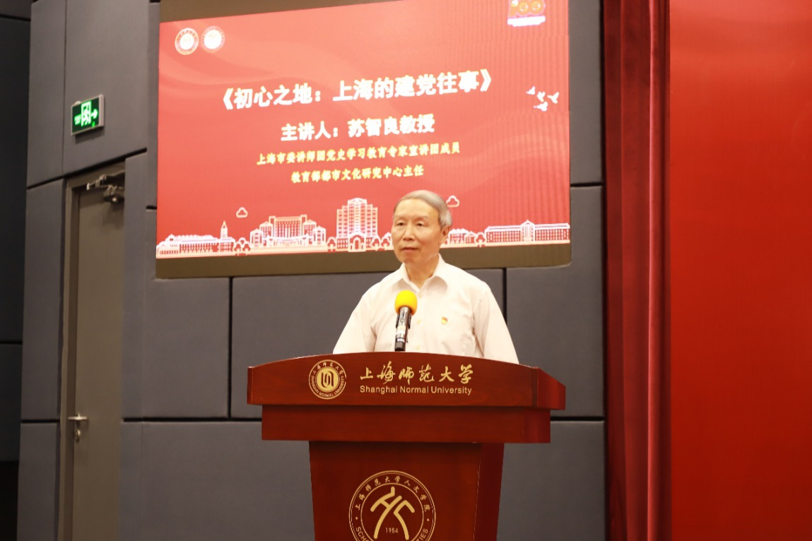 上海市委讲师团党史学习教育专家宣讲团成员,教育部都市文化研究中心主任苏智良教授作“七一党课”——《初心之地:上海的建党往事》。苏教授以“中国共产党的建党之地为什么是上海”这一问题开篇,从上海的城市化、上海的现代化、上海的国际化、新阶层的应运而生、上海建党的文化起源、法租界中的有利环境以及上海成为共产国际关注的建党中心等方面讲述了初心之地的红色记忆、红色资源和红色基因。他分享了自己带领团队寻访、考证和保护红色遗迹的经历,强烈呼吁要寻访并保护好上海红色历史遗迹。在场的党员师生们被苏教授强烈的爱党爱国情怀深深感染着。