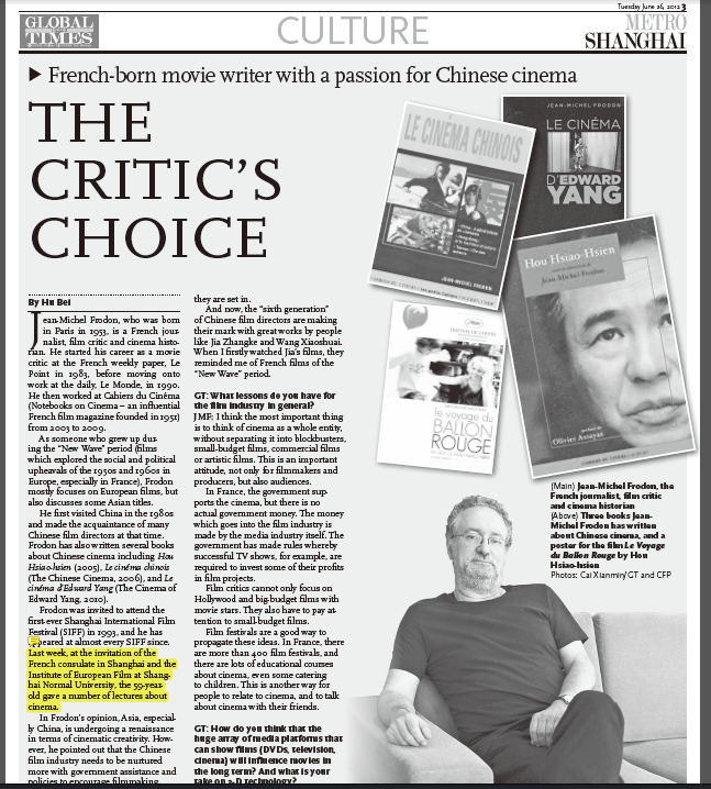 6月26日的《环球时报》(英文版)以整版篇幅报道了本届“上海国际电影节”嘉宾、法国电影理论家让-米歇尔·傅东的专访,傅东此行上海受邀于我院欧洲电影研究中心及其与法领馆文化处合作的【人文·法国·电影学堂】,专程来沪举行了三场“上海国际电影节大师论坛”。