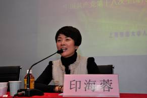 能与每天只能在电视机前看到的知名主播有近距离交流,对于很多党员都是新鲜的体验,当天下午,东部校区57号楼一楼报告厅内座无虚席。印海蓉首先回顾了十八大概况,包括代表组成、会议议程以及党代表们的履职情况,让与会党员们对于整个十八大会议有了一个全方位、生动的认识。之后,她着重介绍了习近平同志作为上海代表团成员,发表的对于十八大报告主题精神解读的讲话,内容包括了深刻理解党的十八大主题,以及全面落实中国特色社会主义事业的总体布局,第一次将生态文明建设问题纳入我党中心工作,将十七大的政治、经济、文化、社会建设的“四位一体”升级为“五位一体”,是体现了以人为本的科学发展方向。印海蓉说,习近平总书记的讲话条理清晰,具有思辨性,对于代表们理解十八大精神有很好的启发。