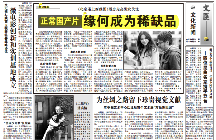 3月25日出版的《文汇报》“文化视点”专栏刊发了《正常国产片缘何成为稀缺品》一文,文章专题采访了我院影视传媒系教师、世界电影研究中心主任王方老师,她就近日广受好评的国产电影《北京遇上西雅图》谈了国产电影的现状、电影的创作与定位,以及影片对中国当代爱情题材电影的价值等。