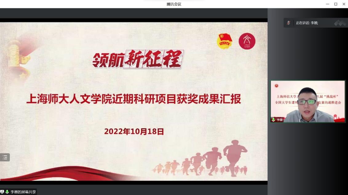 10月18日下午15点30分,人文学院第十八届“挑战杯”全国大学生课外学术科技作品竞赛沟通推进会于腾讯会议线上进行。本次推进会由人文学院党委副书记、副院长陈重来老师主持,“挑战杯”预报名同学、团委科创部同学和项目指导老师等出席会议。