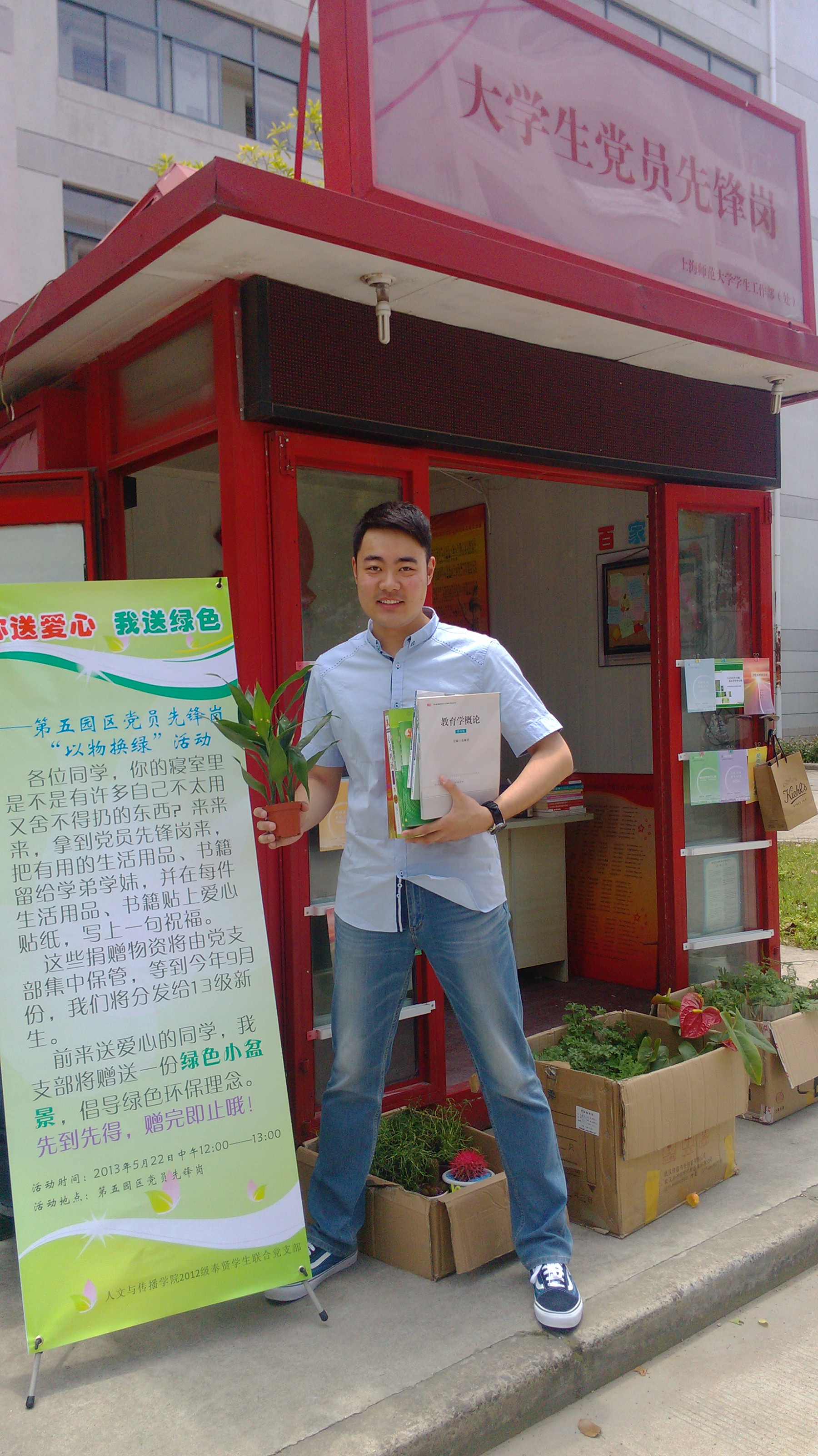 为响应十八大报告中“美丽中国”的号召,发挥学生党员的示范引领作用,向学生宣传环保理念,2013年5月22日中午12:00-13:00,2012级奉贤学生联合党支部于第五园区党员先锋岗开展以“你送爱心,我送绿色”为主题的生态行动,支部全体党员参与了此次主题党日活动。活动呼吁学生准备一份有用的生活用品、书籍捐赠给学弟学妹,前来送爱心的学生,也获赠了一份由支部赠送的绿色小盆景,宣传环保理念。据了解,每件捐赠的物品上贴着爱心贴纸,写满了捐赠者对学弟学妹的祝福。这些物品将由党支部集中保管,9月份将会分发给13级新生中有需要的同学。