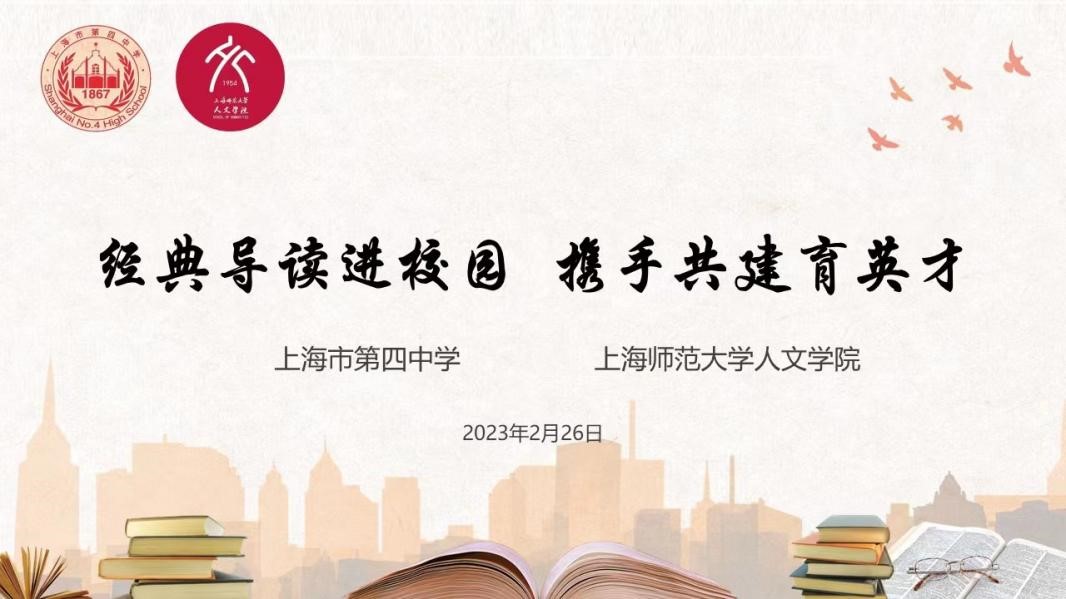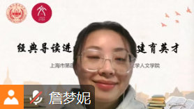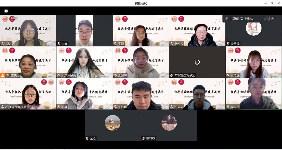 2月26日上午9:30,“经典导读进校园 携手共建育英才”——上海市第四中学、上海师范大学人文学院联合举办的课程建设暨课后服务项目讲师培训会在线开展。上海市第四中学副校长储名方、教导处主任龙琼以及人文学院大学生讲师团新成员参与此次会议。会议由该项目学生负责人、人文学院2021级文艺学专业李康杰主持。