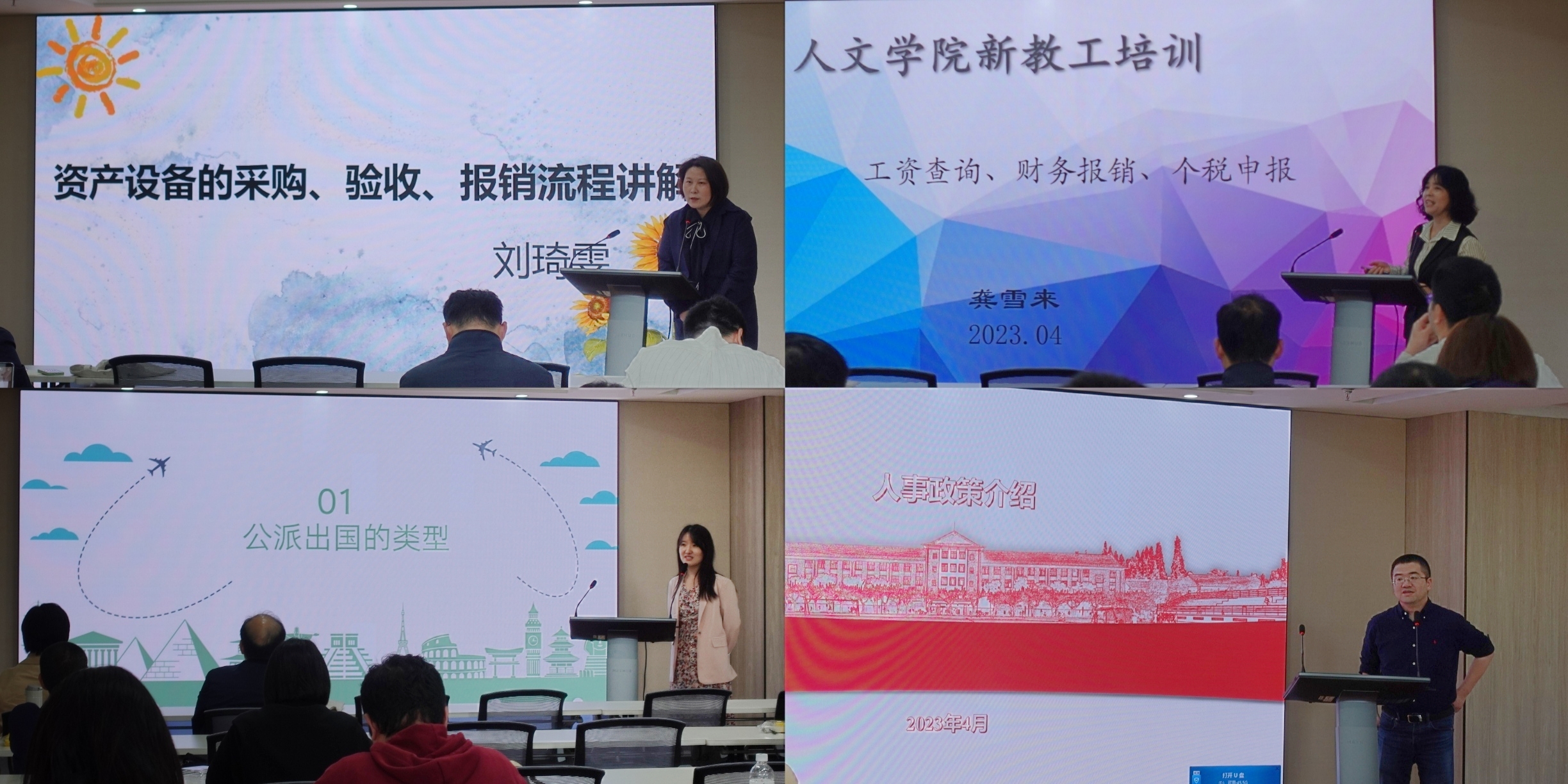 会上,为配合学校最新上线的资产管理平台相关应用,学院资产主管刘琦雯对资产设备的采购、验收、报销全流程进行详细介绍,特别解释了固定资产的验收单制作与报销的“六步走”;财务员龚雪来就工资查询、财务报销和个税申报等内容进行了重点讲解,同时通过列举案例,软件功能演示,帮助与会老师更直观快速地掌握操作方法;外事秘书赵文文解析了教师出国政策,重点介绍了公派出国的类型,公派出国的申请方式等内容,对申报流程和注意事项进行细致梳理;副院长刘畅对新进教师聘期考核和职称聘任的相关办法进行解读,统筹兼顾中青年教师和资深教师的不同需求,帮助其准确把握人事政策。