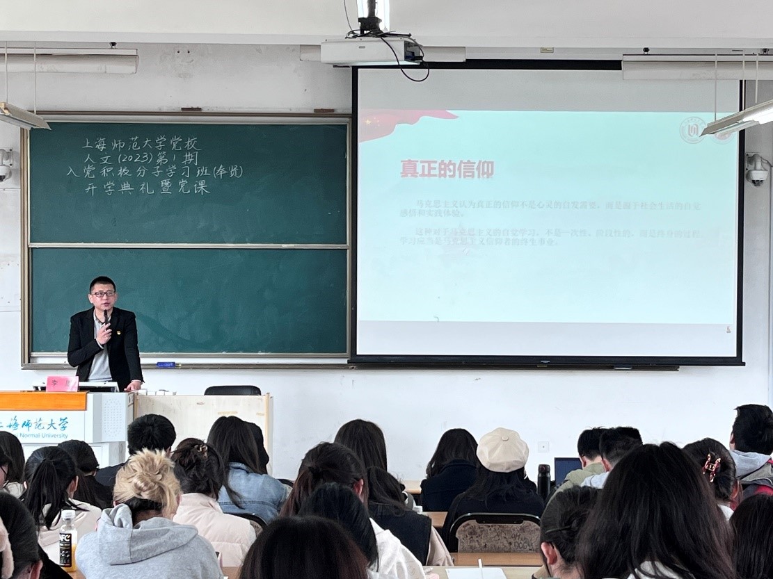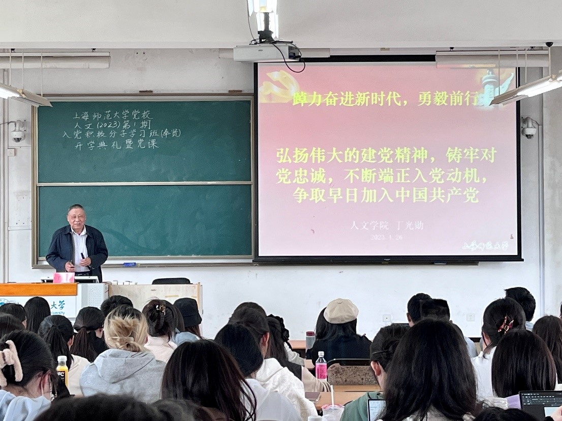 2023年4月26日,上海师范大学人文学院2023年入党积极分子培训班开班典礼于奉贤校区第三教学楼202教室顺利举行。校特邀党建组织员、校关工委讲师团成员丁光勋老师,人文学院团委书记、2020级本科学生党支部书记李墨老师以及人文学院奉贤校区入党积极分子参加开班典礼。开班典礼由2022级本科学生党支部书记、随班班主任孟祥梁老师主持。