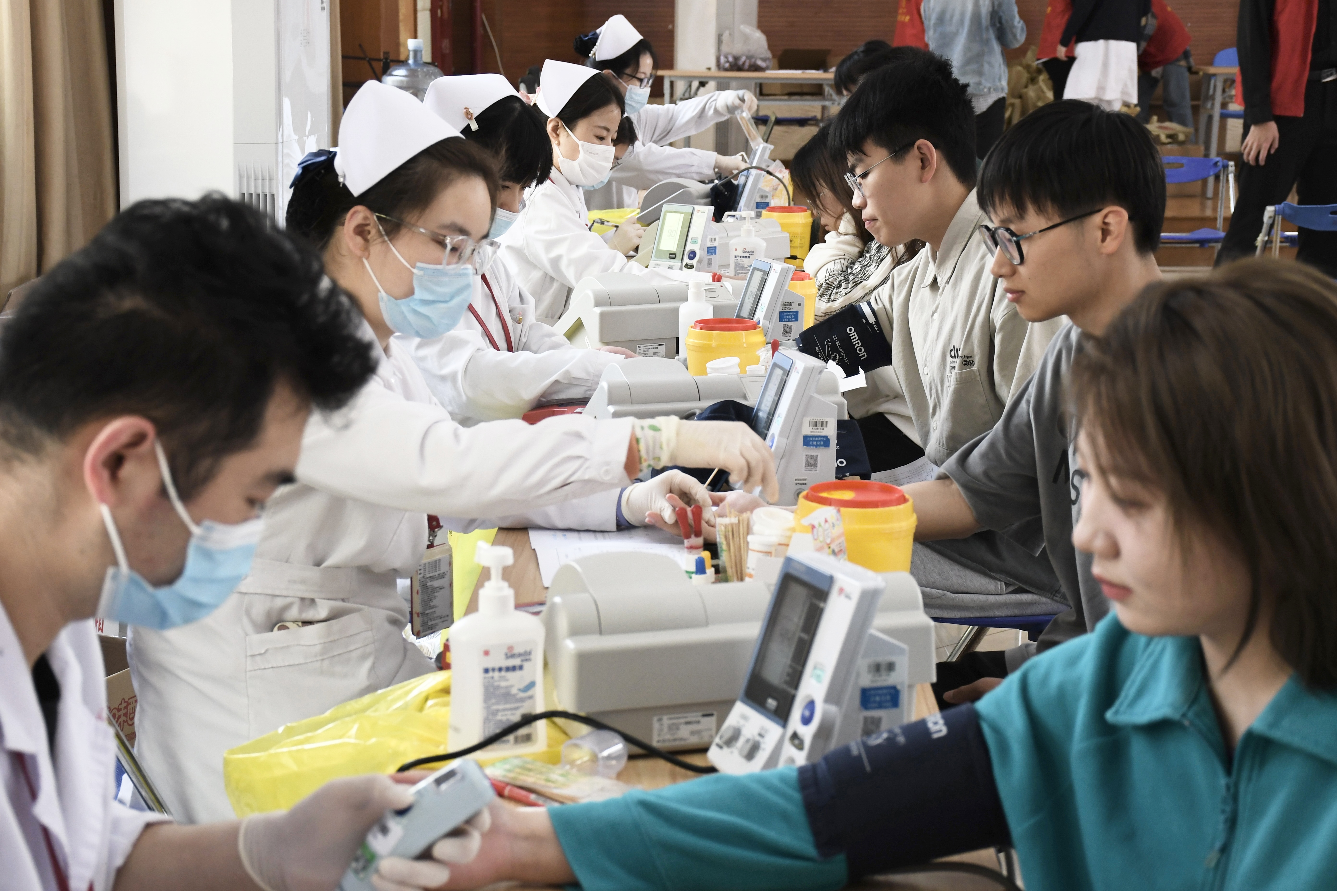 同学们在完成献血初筛后,根据医护人员的安排,依次进行献血活动。现场气氛融洽,医护人员和志愿者也通过言语上的关切与慰问,尽可能地减少同学们的不安。