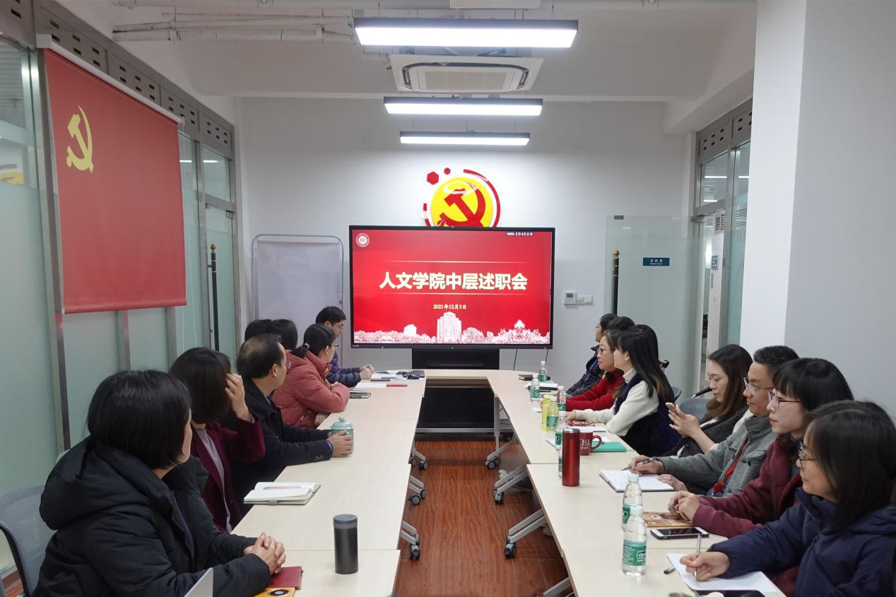 12月3日下午,人文学院2021年度行政中层干部述职会在文苑楼904室举行。院长查清华、院党委书记朱政、副院长孙珏岷、姚潇鸫,以及全体行政工作人员、辅导员等出席会议。会议由副院长孙珏岷主持。