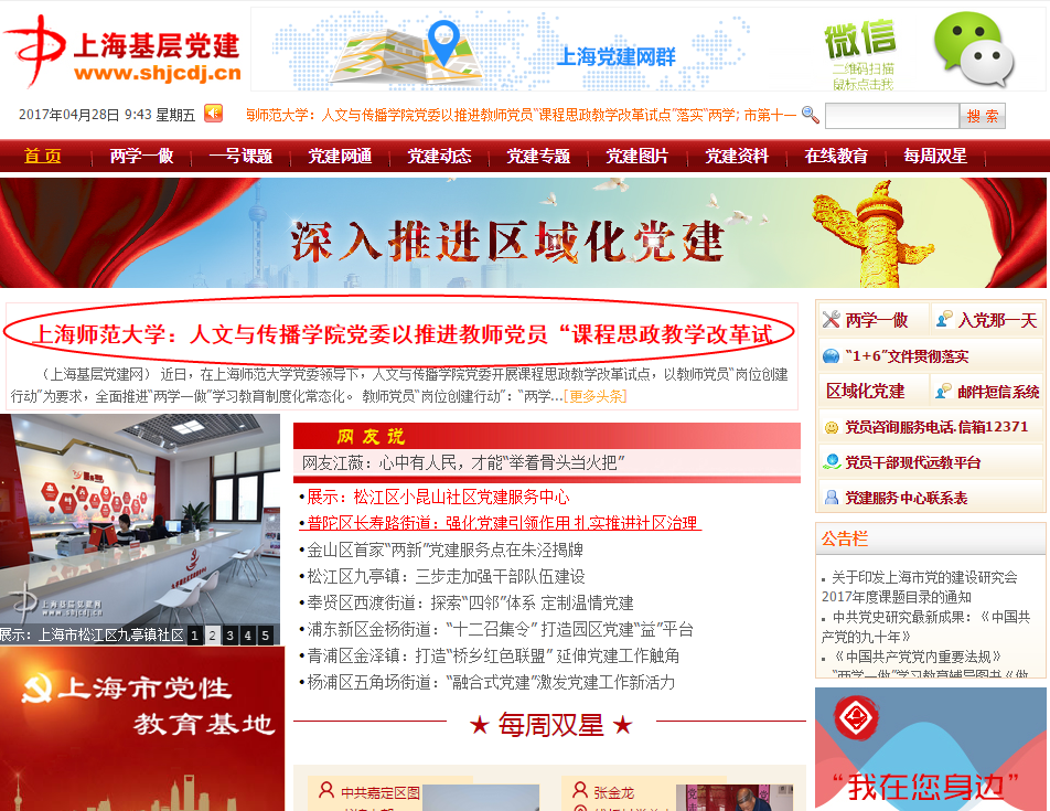 编者按:在上海师范大学党委领导下,人文与传播学院积极探索课程思政教学改革试点,以教师党员“岗位创建行动”为要求,全面推进“两学一做”学习教育制度化常态化。4月28日,上海基层党建网(http://www.shjcdj.cn/djw/)以“上海师范大学:人文与传播学院党委以推进教师党员‘课程思政教学改革试点’落实‘两学一做’”为题,全站头条报道人文与传播学院具体工作。报道全文如下: