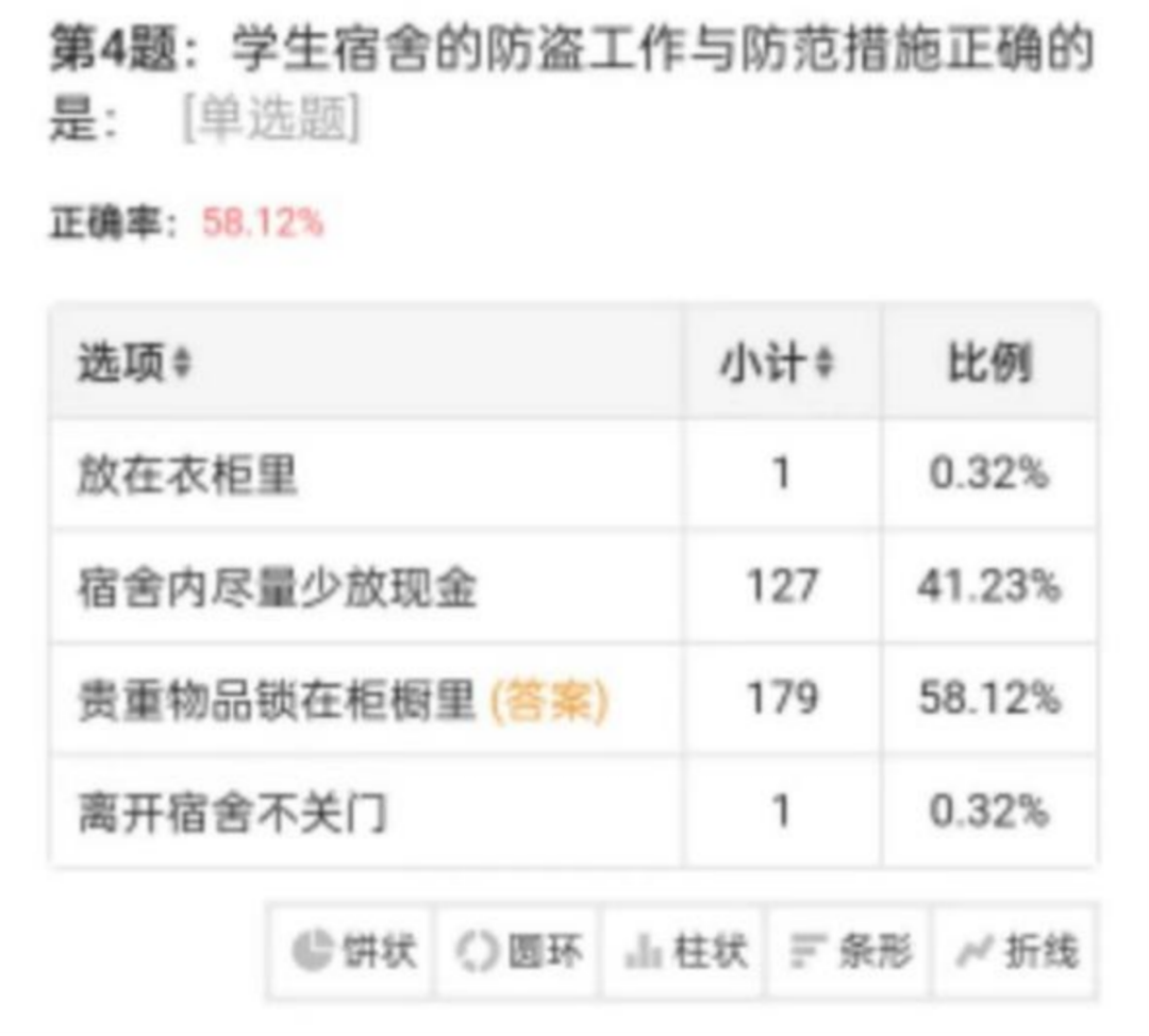 除开展安全教育大课堂外,2022级本科生各班还参与了人文学院组织安排的安全知识竞答活动。同学们热情积极,安全知识的学习和答题覆盖率达到了百分之百。从参赛结果看,学生整体安全意识较强,但在防盗工作方面仍然存在一定的疏忽,有的同学对于宿舍安全防盗及防范意识不够。