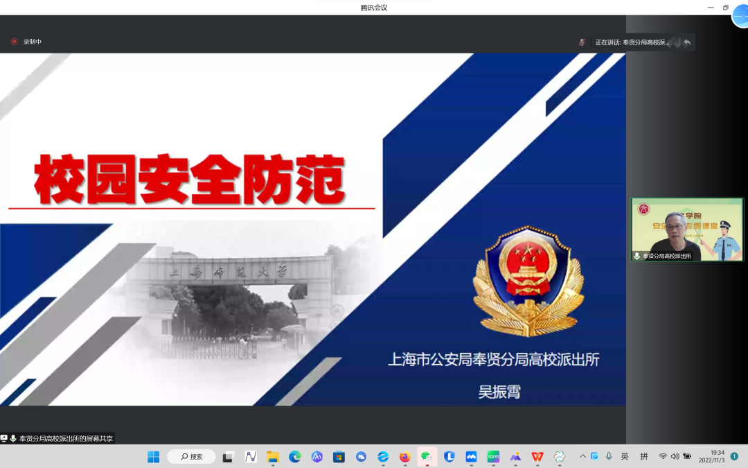 11月3日晚,上海师范大学人文学院邀请上海市公安局奉贤分局高校派出所二级高级警长吴振霄开展校园安全教育专题学习。本次学习采取线上交流的形式,人文学院党委副书记、副院长陈重来,人文学院2022级本科学生党支部副书记、2022级本科生辅导员李妍,人2022级全体本科生和2022级部分研究生代表,共计360余人参与此次活动。