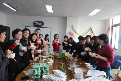 三月十八日中午,文苑楼804室装饰一新,屋内一片欢声笑语,椭圆形的会议桌上琳琅满目,各色美味佳肴令人垂涎欲滴。因故延期的以“智慧女性 巧手妈妈——晒晒我的私房菜”为主题的人文与传播学院庆祝三八国际妇女节主题活动正在进行。参加活动的女教工有50后的老教师,也有80后的小姑娘,有女教授,也有普通员工,大家都带来了自己亲手制作的拿手菜:有色鲜味佳的“水晶虾仁”,有别出心裁的“酒香爆鱼”;有延安特色菜“洋芋擦擦”,也有浓油赤酱的上海本帮菜“走油肉”;“三文鱼牛油果色拉”秀色可餐,“清蒸土鸡”鲜香可口;“焖猪蹄”一抢而空,“酸辣汤”瞬间光盆;这边家庭自制的蛋糕、寿司、蛋挞挑动着大家的味蕾,那边的手工牛肉蔬菜馅儿饺子热腾腾地下锅了……大家边品尝满桌美味,边切磋厨艺,交流生活中的小窍门。女同胞的节日活动离不开男同胞们的支持,分党委书记戴冰老师带来了学院的祝贺和关怀,也带来了年轻人的活力;工会副主席任荣老师忙前忙后,事无巨细,亲力亲为,成为公认的“妇女之友”;学工组的小伙子忙着为大家切水果,看那熟练的刀工手势,想必在家里也是尊重关心女同志的模范。