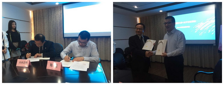 日本JJ股份有限公司关本正和先生(左)和上师大人文学院院长陈恒先生(右)共同签署2016河合奖学金续约协议