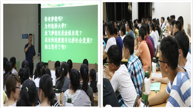 2015年9月6日晚,人文与传播学院2015级新生军训连排活动之入党启蒙教育在奉贤校区四教进行。学院党委戴冰老师、杨康贤老师、陈重来老师分别为六个连排活动教室、559名新生作“扬起梦想与信仰的风帆”为主题的宣讲。