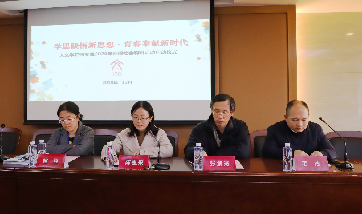 12月11日下午,“学思践悟新思想·青春奉献新时代——人文学院研究生2020年寒假社会调研启动仪式”在徐汇校区东部文苑楼602举行。人文学院副院长张剑光、历史系副系主任姚霏、中文系教师毛杰、学院研究生辅导员以及2020年寒假社会调研参与研究生代表出席活动。活动由学院党委副书记、副院长陈重来主持。