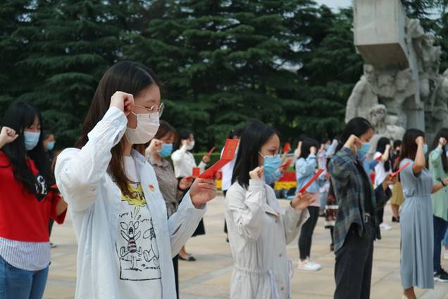 在领誓人、研究生辅导员王雅婷老师的带领下,35名毕业班学生党员重温入党誓词,再作庄严宣誓。“面向鲜艳的党旗,右手握拳过肩重温入党誓词的这一刻,心中的光荣感和使命感油然而生。”此情此景,毕业班党员贵浩泽深感触动,入党誓词字数不多,但字字扣心,句句千钧,记住入党誓词不难,难的是终身坚守。学院党委副书记陈重来满怀深情地说道:“今天我们来到这片革命烈士洒下鲜血的土地再次重温誓词,希望你们能记住自己在党旗下立下的誓言,在日后工作中,时刻铭记,加以对照,坚定不移,终身不渝,努力成长为一名优秀的共产党员!”