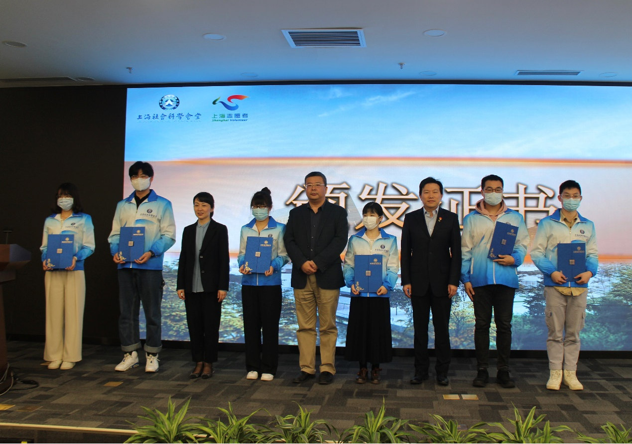 在会议第一阶段,上海市社联党组成员、专职副主席任小文作动员讲话。他首先了介绍社科主题馆馆藏签名图书征集工作概况,对上海市文明办、上海市志愿者协会、上海师范大学人文学院等单位的大力支持表示了感谢,高度肯定了我院信管系师生参与志愿服务的热情与积极性,并希望具备专业素养和服务意识的志愿者们,能够在此项工作中发挥学业所长,获得成长。随后,朱政书记与其他与会嘉宾共同为志愿者代表颁发了证书。