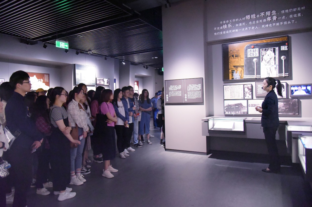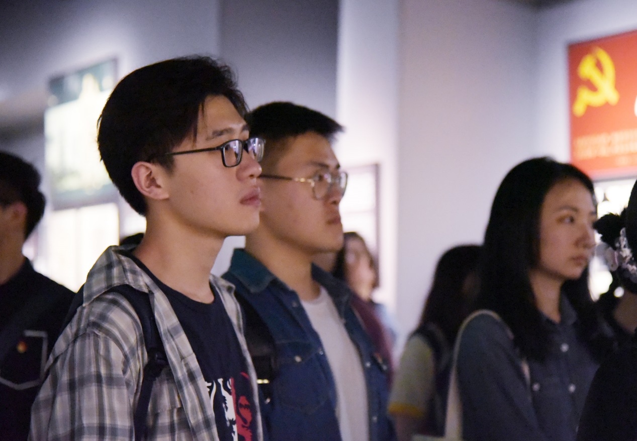宣誓仪式结束后,党员同志们进入纪念馆参观。在讲解员的带领下,党员同志们沿着历史的轨迹,走进那段战火纷飞的岁月。其中,极具震撼力的《二十四烈士雕塑多媒体剧场》将高科技全息投影与舞蹈完美结合,让二十四烈士感人至深、可歌可泣的事迹变“活”了。当看到这群风华正茂的年轻人为了党的事业顽强拼搏,最终被敌人的镣铐和铁链送上刑场时,2019届本科毕业班党员柯婧同学不禁流下了难过的泪水:“这样一群年轻人,当他们面对死亡、走上刑场的时候仍然抬头挺胸,那是因为他们看到了一个光明的未来,他们的内心有着对中国共产党必胜、人民得到解放的信念,他们走向的不是死亡而是希望。”先烈们为革命事业献身的大无畏精神,践行共产主义的坚定不移的信念,将斗争进行到底的坚守与不屈,正鼓舞着新时代青年努力抒发爱国情,树立报国志,不忘初心,砥砺前行。