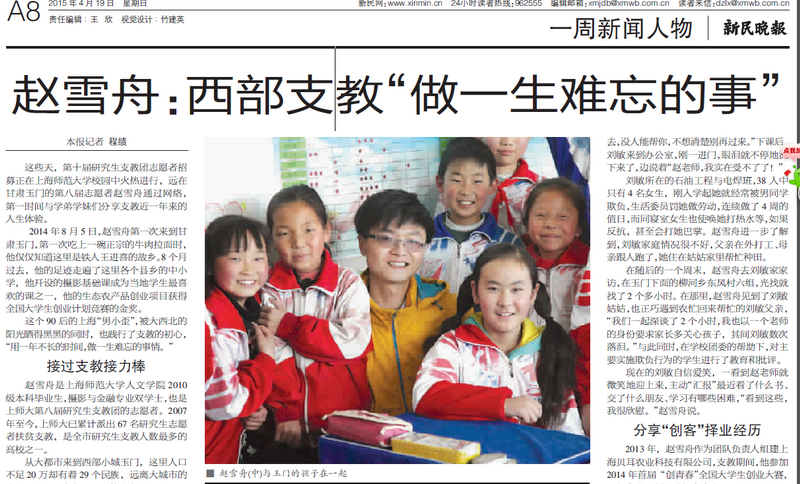 4月19日《新民晚报》专题报道我院2010级摄影专业学生党员赵雪舟同学支教事迹。