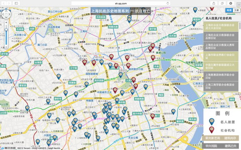 今年是世界反法西斯战争暨抗日战争胜利70周年,上海作为中国抗击日本侵略的重要城市,在抗战历史中留下了许多珍贵的印记和资料。我校人文学院、都市文化研究中心联合腾讯网、腾讯大申网共同制作了上海抗战历史系列地图。该系列地图以地理信息系统数据库、GIS技术为支撑,以直观、科学的时空分布图为表现形式,有侧重地再现了1931年九一八事变到1945年间两次淞沪战役及与八年抗战相关历史要素。为了便于人们更加简单、直观、便捷地了解有关上海抗战历史要素,最终呈现方式将是关于上海抗战历史的五张不同历史要素图,分别为《上海抗战历史地图系列一——抗日救亡分布图》、《上海抗战历史地图系列二——淞沪抗战分布图》、《上海抗战历史地图系列三——组织机构分布图》、《上海抗战历史地图系列四——事件暴行分布图》、《上海抗战历史地图系列五——慈善救助分布图》。