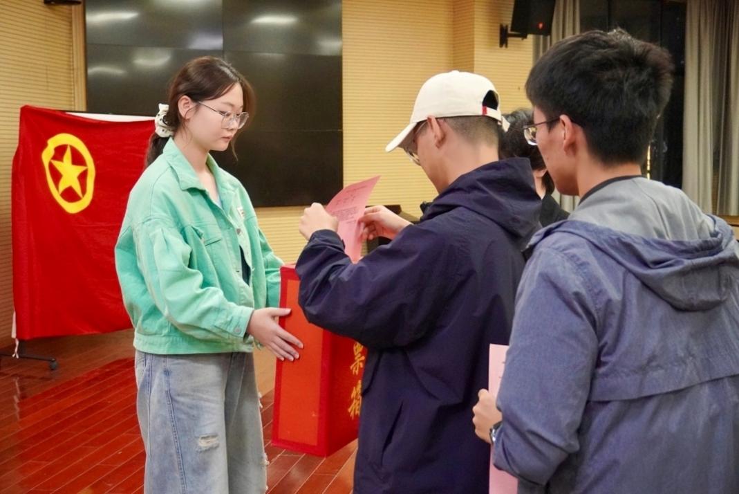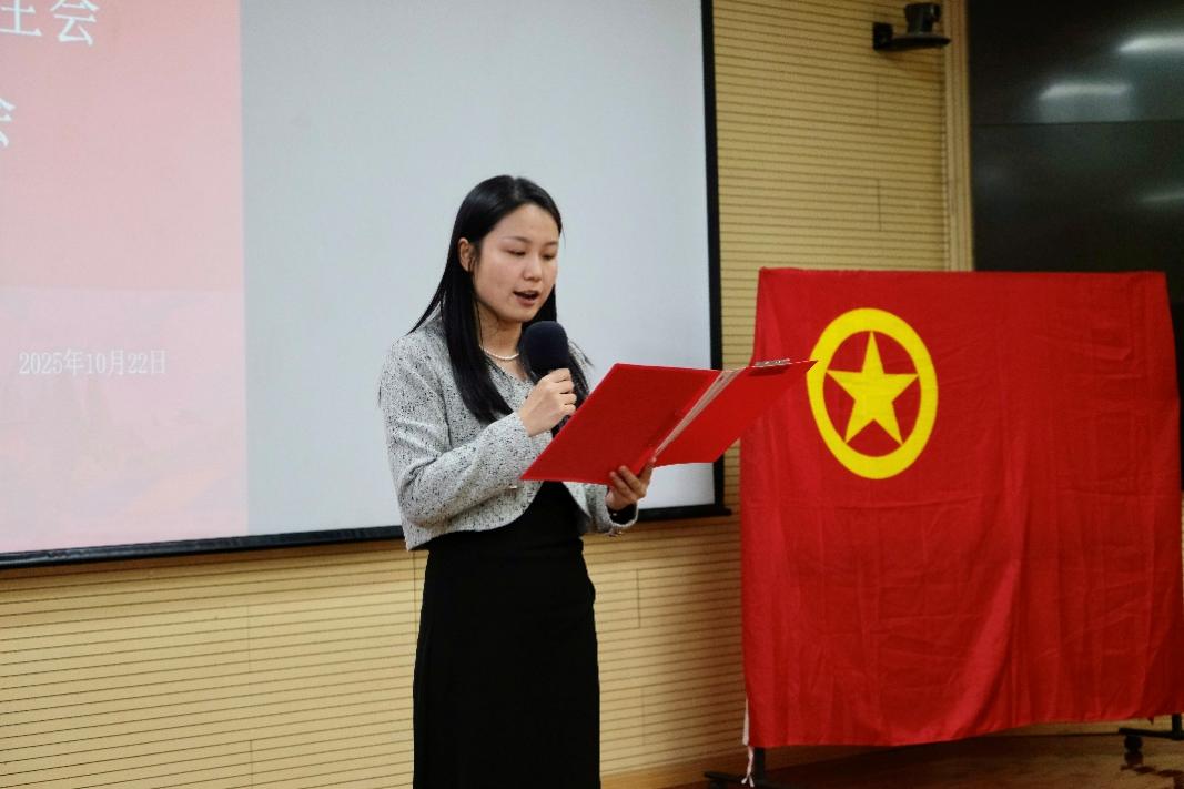 团支部书记金思贝同学作表态发言:“我们将不忘初心、不负重托,将‘服务者、引领者、创新者’的思想落实到具体行动中去,力争更好地为同学服务、为学院添瓦。”