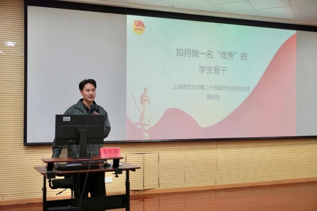人文学院学生会主席团成员蒋廷宇进行培训课程内容情况介绍。他指出,本次秋季培训将采用线上线下相结合的模式开展,涵盖理论培训、实务培训、朋辈分享、实践素拓四大板块,并详细介绍了活动具体内容。