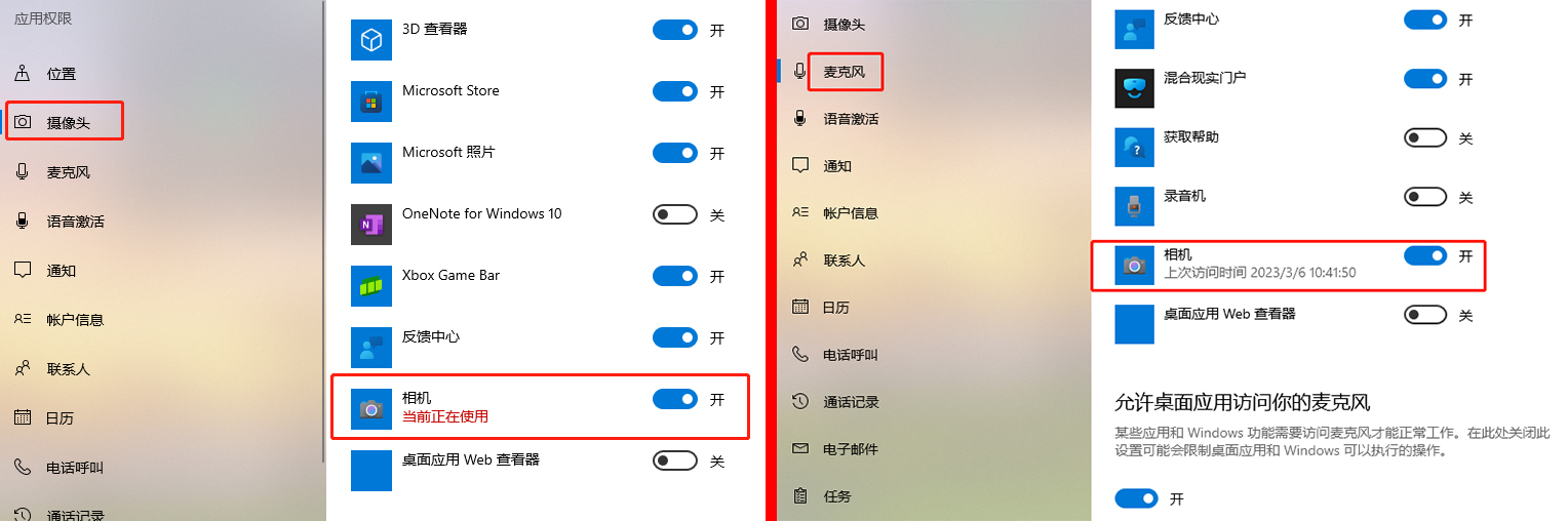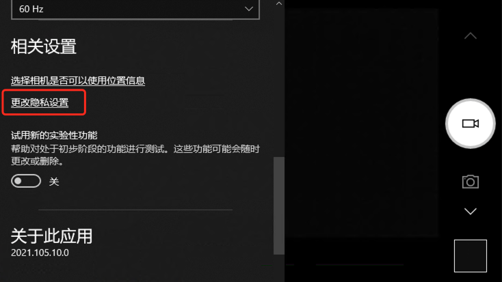 如果使用相机时提示权限不足,则可以点选“更改隐私设置”来给“相机”程序添加使用摄像头和麦克风的权限。
