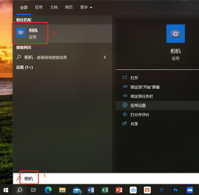 一、开启相机。在搜索栏里键入“相机”可以快速找到相机应用。